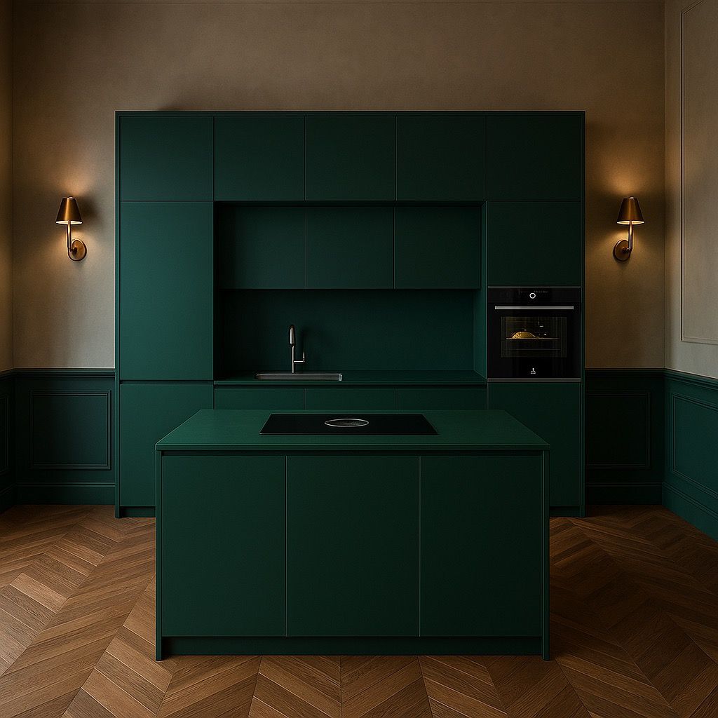 Il verde petrolio è intenso e sofisticato. È perfetto per chi desidera una cucina contemporanea con una presenza forte ma raffinata. Funziona molto bene negli open space e negli ambienti luminosi.