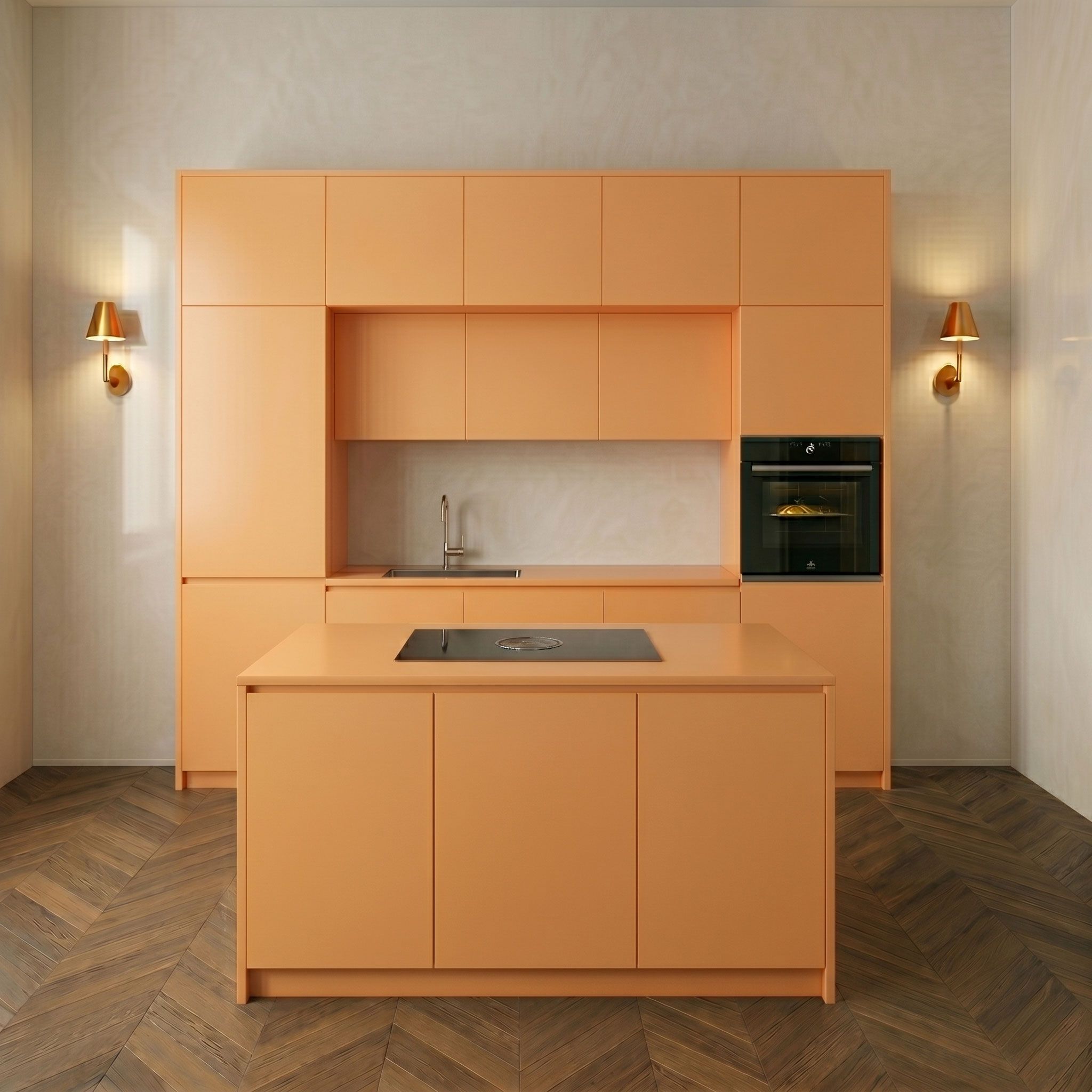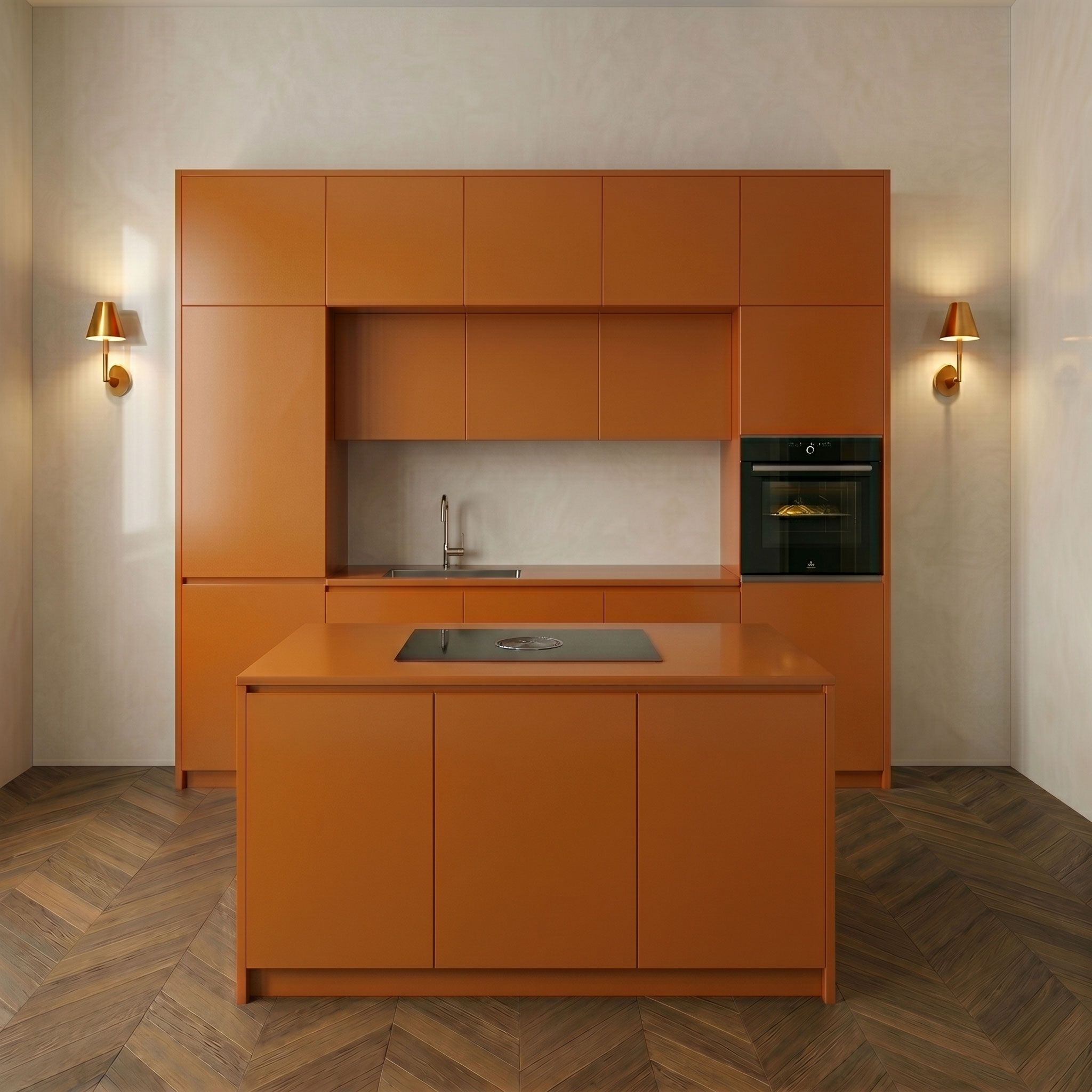 La cucina monocolore arancione può sembrare una scelta audace, ma se progettata con equilibrio crea un effetto sorprendentemente armonico.