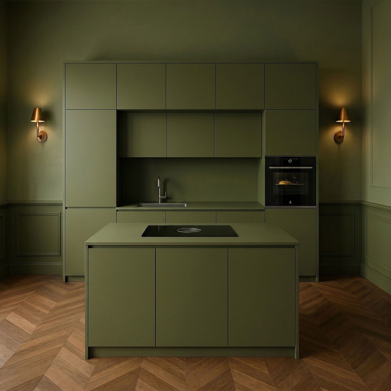 Più caldo e profondo, il verde oliva crea un effetto avvolgente. È adatto a spazi ampi e a chi desidera una cucina verde moderna con una forte componente materica.